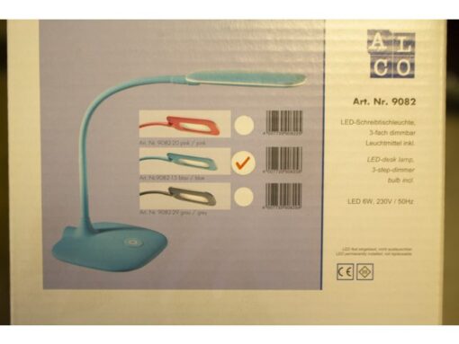 LED bureau lamp in moderne kleuren, met zijn fluwelen look is hij een echte eye-catcher op ieder bureau. de LED lamp heeft een flexibele arm en is in 3 stappen dimbaar. kleur blauw/turquoise. Vermogen: 5 watt, lichtstoom 420 lumen, Lichtkleur 4.000K. Afmeting 160x330mm.