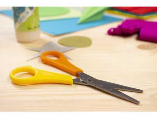 Kinderschaar, 13cm. Met spitse punt. Geschikt vanaf 6 jaar. Voorzien van 5 cm schaalindeling. Garantie: 3 jaar. Geleverd op blisterkaart met europonsing. Kleur geel/oranje, linkshandig.