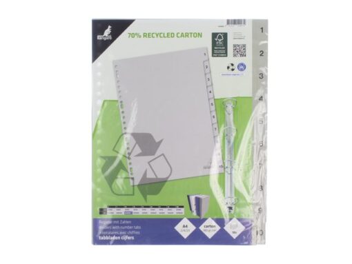 Primeur: Kangaro tabbladen van gerecycled karton FSC, voorzien van milieukeurmerk Blauwe Engel. De 10-delige tabbladen set is uitgevoerd in 180 grams grijs, duurzaam en milieuvriendelijk karton en eenzijdig aan de voorzijde genummerd. De tabbladen zijn voorzien van 23-gaats perforatie. Het keurmerk Blauwe Engel garandeert een verantwoorde en duurzame bijdrage aan het milieu.