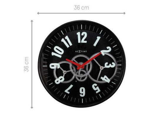De NeXtime “Moderne Gear Klok” heeft een zwarte wijzerplaat, een zwarte kast en een duidelijke witte cijferindex die op de glasplaat is gedrukt. Dit ontwerp heeft een eigen draai geven aan een klassiek gear klok ontwerp door de combinatie van moderne rode wijzers, een duidelijke cijferindex en zilver kleurige bewegende kunsstof tandwielen. Deze wandklok is 36 cm en werkt op 1 AA batterij (niet inbegrepen)